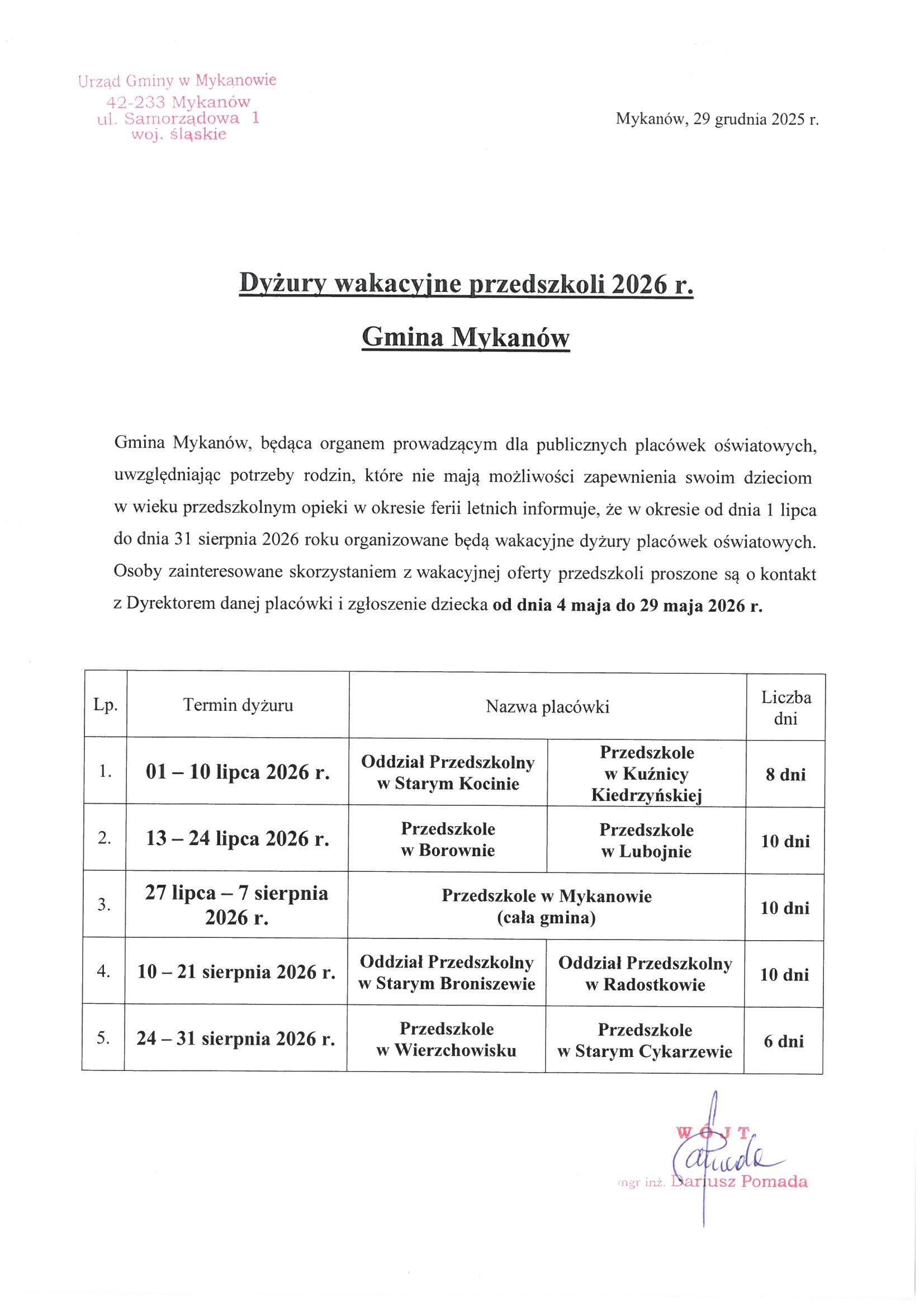 Poniżej harmonogram dyżurów wakacyjnych pozostałych placówek Gminy Mykanów.