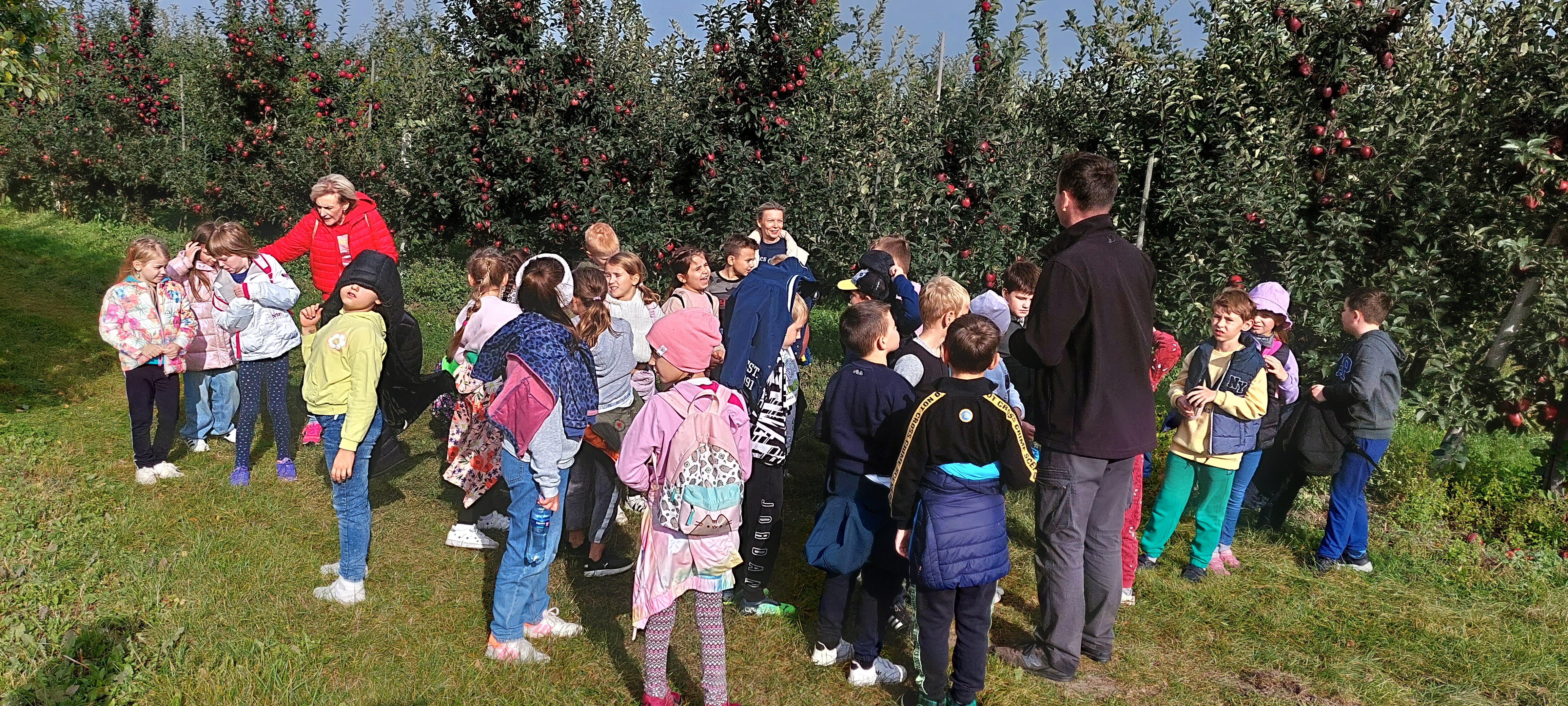 Celem wyjazdu były warsztaty edukacyjne. Uczniowie korzystając z pięknej pogody spacerowali po sadzie, poznając rosnące tam gatunki jabłek, gruszek oraz śliwek. Przypomnieli sobie także budowę owoców. Aby przyjemności stało się zadość - uczniowie mogli skosztować zerwanych przez siebie i prosto z drzewa – pysznych owoców. Po spacerze udaliśmy się w kolejne miejsce, by wziąć udział w jeszcze przyjemniejszej części warsztatów… Nasi milusińscy na zajęciach praktycznych kroili zerwane owoce i własnoręcznie wyciskali z nich sok - w ręcznej prasie do owoców. Po tym rozkosznie upajali się znakomitym i zdrowym smakiem owocowym. Po degustacji nastąpiła niewątpliwie najprzyjemniejsza część warsztatów – ognisko. Tam uczniowie mogli upiec kiełbaski i posłuchać opowieści gospodarza o uprawie owoców, zwierzątkach odwiedzających sad oraz innych ciekawych historii.
