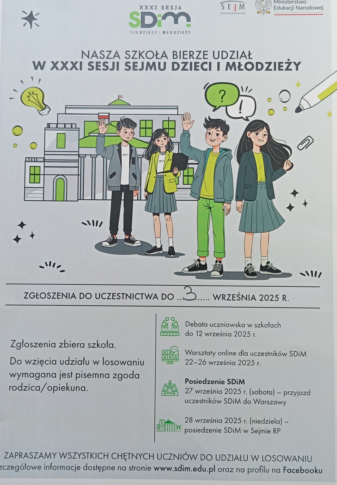 Z ogromną radością informujemy, że nasza szkoła, jako jedna ze 153 placówek z całej Polski, została wylosowana do udziału w XXXI sesji Sejmu Dzieci i Młodzieży. Losowanie, które objęło wszystkie szkoły podstawowe w Polsce, odbyło się 4 czerwca. Podczas wyboru zachowano proporcjonalny podział na poszczególne województwa.
