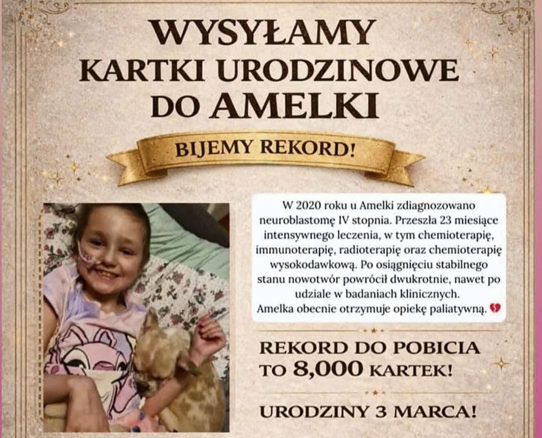 Nasze przedszkole wzięło udział w wyjątkowej akcji- dzieci, podczas ferii, tworzyły kartki urodzinowe dla chorej Amelki, której marzeniem jest pobicie Rekordu Guinessa w liczbie otrzymanych kartek. Przedszkolaki z ogromnym zaangażowaniem i sercem przystąpiły do tworzenia swoich prac. Powstały piękne, kolorowe kartki pełne najlepszych życzeń, ciepłych słów i dziecięcej radości. Amelka jesteśmy z Tobą i mamy nadzieję, że Twoje marzenie się spełni.