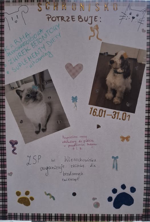 Wolontariusze naszego szkolnego koła wraz z opiekunami zorganizowali zbiórkę charytatywną na rzecz podopiecznych schroniska – psów i kotów, które każdego dnia czekają na dom, opiekę i pełną miskę.