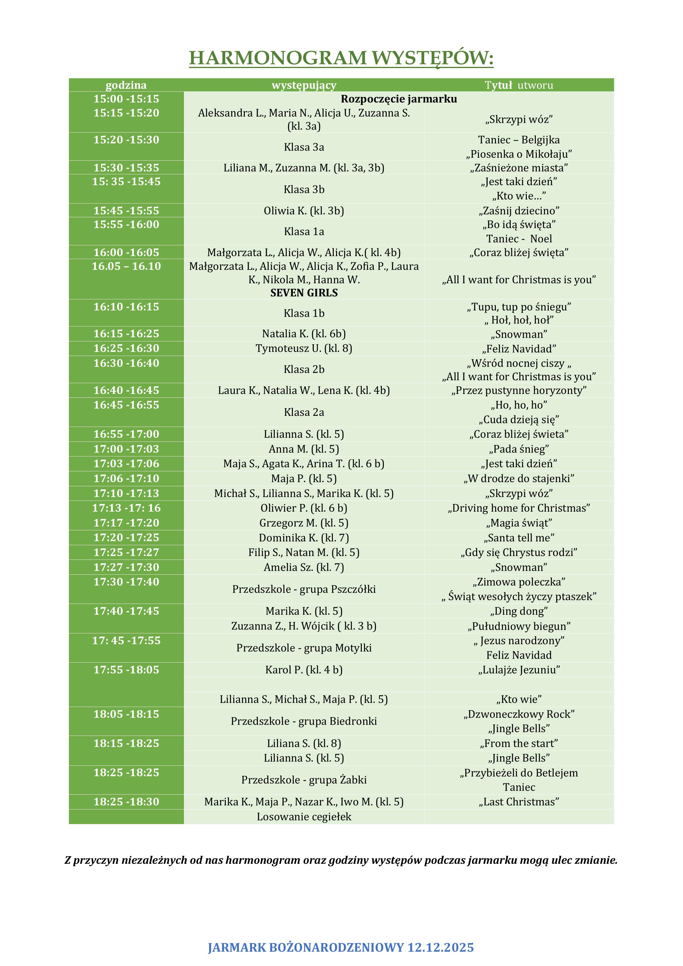 12 grudnia 2025 roku w Wierzchowisku odbył się Jarmark Bożonarodzeniowy. To już czwarta edycja tego wydarzenia. Przygotowania do tej uroczystości trwały juz od października. Przedszkolaki oraz uczniowe naszej szkoły bardzo wcześnie rozpoczęli przygotowywanie pięknych, oryginalnych ozdób świątecznych i dekoracji. Wśród nich były piękne szopki, stroiki, bombki, skrzaty i inne wyjątkowe dzieła. Uroczystość ubarwiły wspaniałe występy naszych przedszkolaczków oraz uczniów. Były tańce, śpiewy oraz pokazy instrumentalne. Całość dopełniała pachnąca i kusząca kawiarenka ze świątecznymi przysmakami, które przez całą uroczystość miały duże powodzenie. Jarmark przebiegł pomyślnie, frekwencja dopisała. To zasługa naszych pracowników oraz Rady Rodziców, którzy w każdym roku są niezwykle zaangażowani w przygotowanie właśnie tego wydarzenia. Dziękujemy wszystkim, którzy wsparli nas w tym dniu pod każdą postacią. DZIĘKUJEMY i zapraszamy w przyszłym roku.