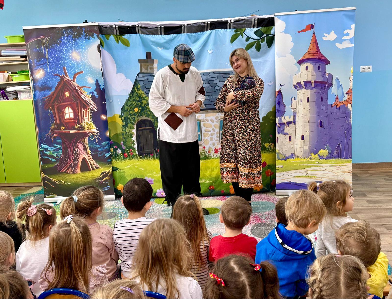Nasze przedszkolaki po raz kolejny miały możliwość przenieść się do świata bajek i baśni goszcząc aktorów ze studia teatralnego z interaktywnym przedstawieniem. Tym razem artyści zabrali nas do świata Roszpunki, która jako mała dziewczynka została porwana od rodziców przez złą czarownicę. Była to dla nich kara za kradzież, której dokonali w ogrodzie wiedźmy. Dzieciaki, dzięki aktywnemu udziałowi mogły razem z głównymi bohaterami podejmować decyzje oraz zrozumieć ich konsekwencje. Na szczęście przedszkolaki doskonale wiedziały, co jest dobre, a co złe, a bajka zakończyła się słowami "żyli długo i szczęśliwie".