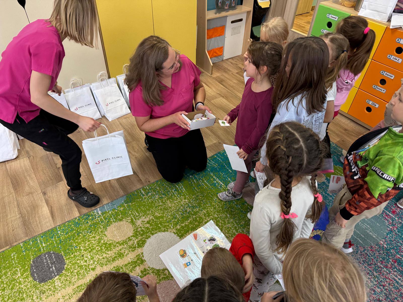 Kilka dni temu nasze przedszkolaki odwiedziły panie higienistki stomatologiczne z „Pixel clinic”, które w ramach zajęć profilaktycznych zapoznały dzieci z prawidłową techniką mycia zębów, omówiły, jaki negatywny wpływ na zęby ma spożywanie cukru, a także opowiedziały, na czym polega ich praca w gabinecie dentystycznym. Serdecznie dziękujemy za odwiedziny i ciekawą oraz pouczającą lekcję, a także za prezenty.